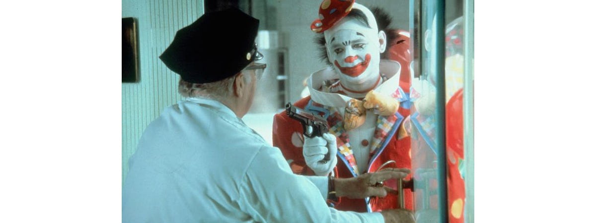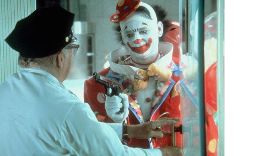 Plenty of ‘80s comedies would’ve just ridden this premise for 90 minutes. Plenty of thrillers would’ve been more than satisfied settling with the tropes the picture trots out – the tellers and customers held hostage in the vault, the tense negotiations with the cops, the inevitable scrum of New York looky-loos outside – meandering their way towards Grimm’s (and author Cronley’s) brilliant escape plan. To wit: Grimm loses the clown get-up and comes out in a different disguise as a hostage. His two similarly made-up accomplices, Phyllis and Loomis (Geena Davis and Randy Quaid), do the same; all three smuggle out the cash, ditch their disguises, and make for the airport while the cops are still surrounding the bank. (Seriously, I hope Cronley bought himself a nice steak dinner after he thought this up.)