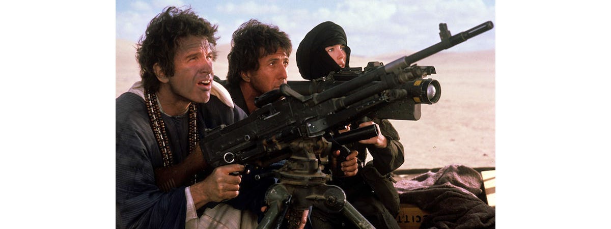 In fact, Ishtar is much more political than the Bob Hope and Bing Crosby “Road” pictures that were its inspiration (May even considered titling it Road to Ishtar, though the suits presumably assured her ‘80s moviegoers would have no idea what she was referencing). And she does emulate those films in the set-up — showbiz comedy in an exotic location, with two guys fighting over a pretty girl — but not really in execution. Beatty and Hoffman don’t have that duo’s ironic detachment or winking self-awareness; these two are closer to the earnestness of Laurel and Hardy (or the stupidity of Larry and Curly, especially when they’re briefly pitted on opposite sides of the conflict, two dim guys trying to outwit each other).