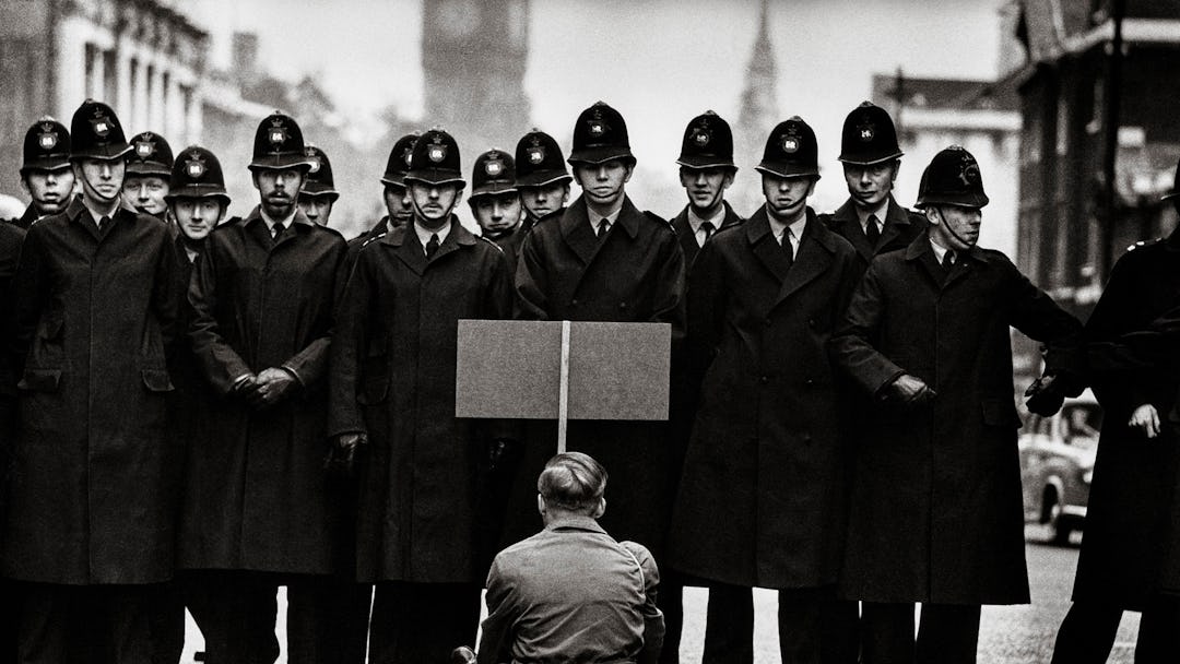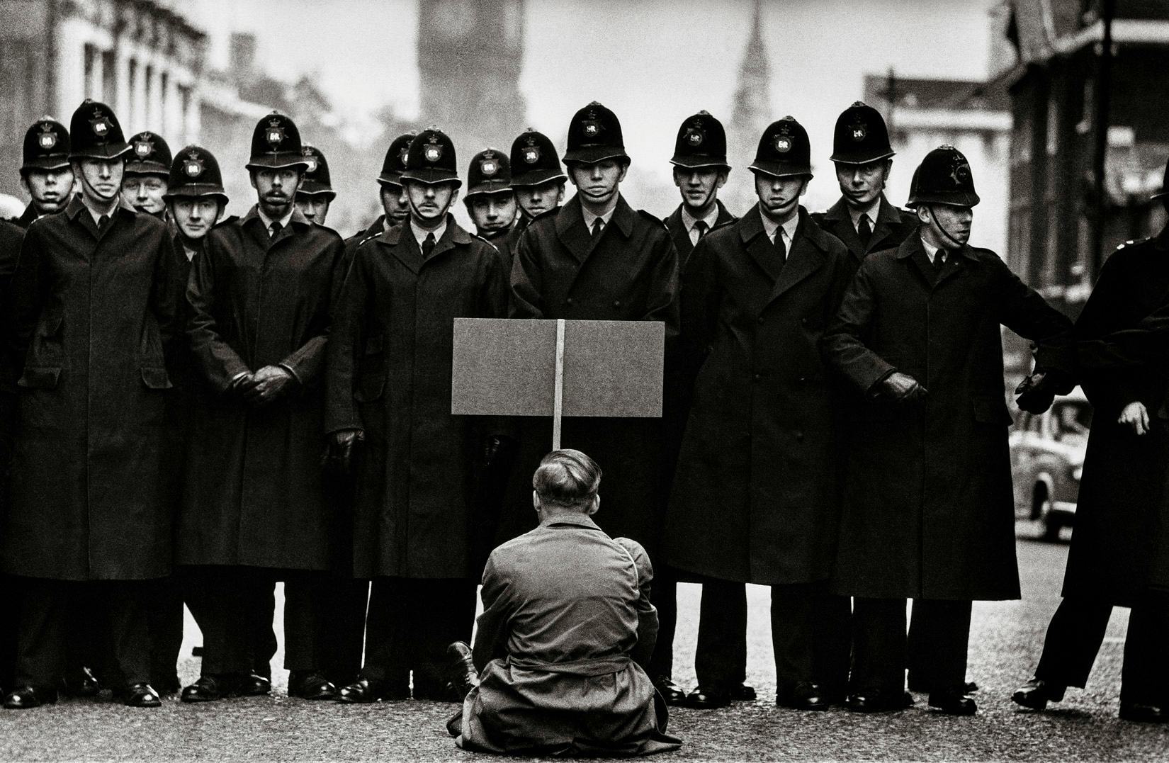 “In 1962, when the world nearly went to war again over the Cuban Missile Crisis, there were massive demonstrations in London’s Trafalgar Square and Whitehall, where this shot was taken. This one man broke from the rabble of many thousands trying to make a run for 10 Downing Street, the prime minister’s residence. Police formed a cordon to prevent him and to hold back ensuing crowds. So he made his political statement by sitting himself down in front of them. What slogan was he brandishing on that banner? Who was he? What happened to him? His statement may have made headlines, but he remains forever anonymous, caught up entirely in his own activism.”