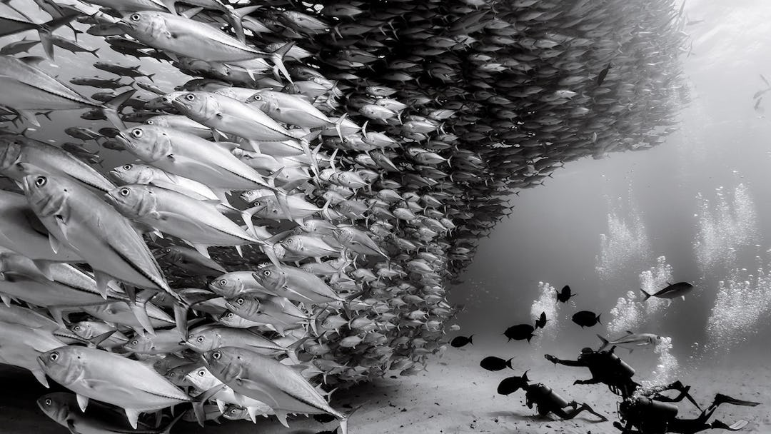 When we think of underwater photography, those thoughts are usually in vivid color, capturing the deep blues of the waters and the bright saturation of aquatic creatures. That's part of why Christian Vizl's photography, captured in the new book Silent Kingdom, is such a revelation: he shoots the world beneath the water in stark yet shining blaack and white, emphasizing the light, dark, and shadow of the deep blue sea, and capturing the shape and presence of the creatures who live there. Here are a few of the astonishing images from this beautiful book; you can see more on Vizl's website, Instagram, or Facebook - or in Silent Kingdom, which first came to our attention via My Modern Met, and is available now from Mandala Publishing.